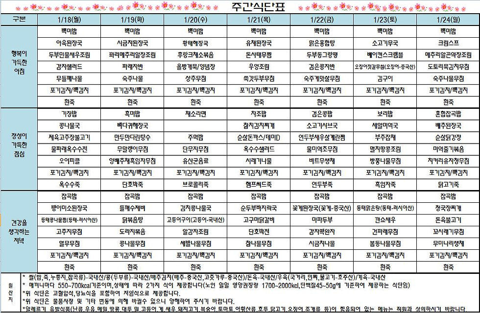 21년 1월 셋째주 일반식 환자 식단표 입니다.