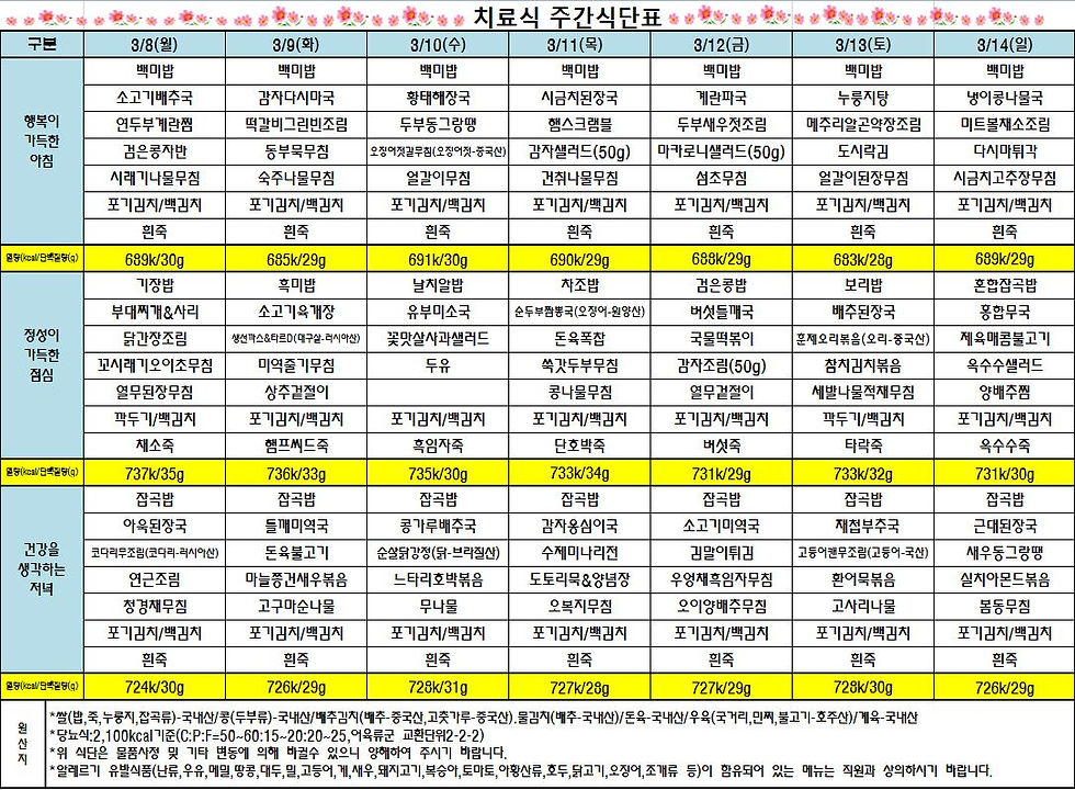 21년 3월 둘째주 치료식(당뇨식) 식단표 입니다.