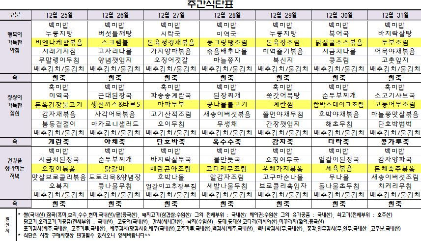 23년 12월 넷째주 환자용(일반식) 식단표 입니다.