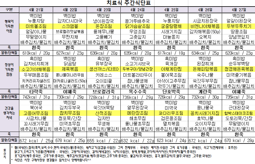 25년 4월 넷째주 치료식(당뇨식) 식단표 입니다.